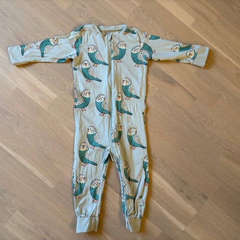 H&M haalari, koko 92. Materiaali polyesteriä. Väriltään kirjava: tummansininen pohja ja moniväriset pallokuviot. Edessä vetoketju ja kaksi vetoketjutaskua (kangasvetimissä pientä kulumaa). Hupullinen malli, jossa kuminauharesorit hihoissa ja lahkeissa sekä jalkalenkit lahkeiden alla, joissa kulumaa (ei nappeja joiden avulla kätevästi saisi vaihdettua). Kunto muuten erinomainen.