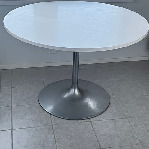 Jämäkkä pyöreä pöytä metallisella trumpettijalalla. Kannen halkaisija 110 cm. Kansi voidaan irroittaa kuljetusta varten.