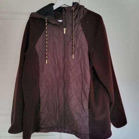 Myyntiin naisten parkatyyppinen, hupullinen, kevyemmällä tikkivuorella varustettu takki. Puuvillaa. Musta alkuperäiseltä väriltään, mutta ajan saatossa haalistunut. Kulumaa tosiaan haalistuman muodossa, sekä esim. neppareissa. Muutoin ehjä.