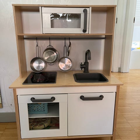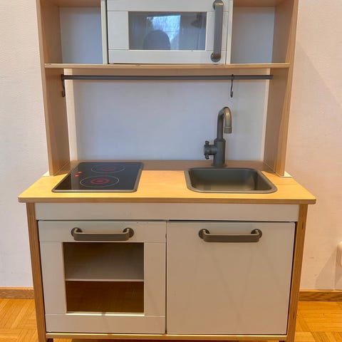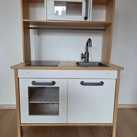 Hyväkuntoinen Ikea Duktig leikkikeittiö keittiötarvikkeilla ja leikkipitsalla seuraavalle pienelle kokille.