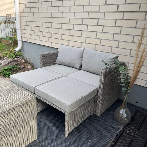 Myydään kesäkalustekulmasohva ja rahi. Jokainen moduuli on mahdollista käyttää erikseen ja tehdä mieleinen kokonaisuus. Sisältää 2 kulmapalaa, 2 välipalaa ja 1 rahi
