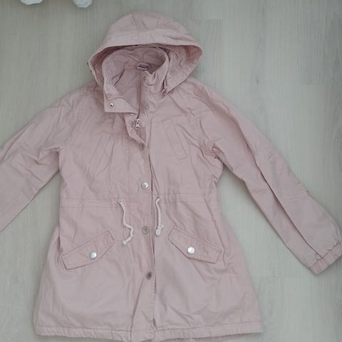 Tyttöjen takki, koko 146 -152 cm. Väri beige. Materiaali puuvillaa. Takissa on kaulus, nappikiinnitys edessä sekä useita etutaskuja. Hihansuissa napit ja olkapäillä tampit. Selkäpuolella joustokaitale vyötäröllä. Soveltuu arkipukeutumiseen ja välikausikäyttöön tytöille noin 10–11 vuoden iässä, pituus noin 146 cm.