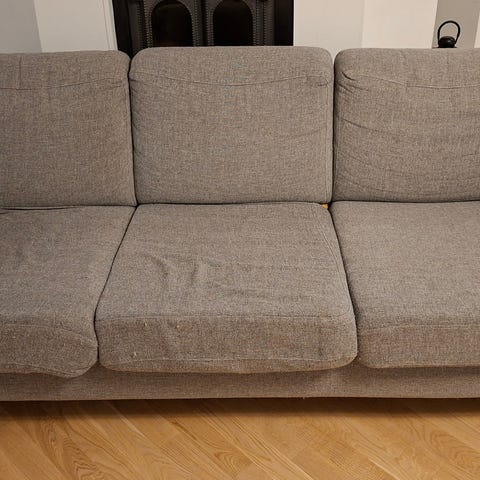&Tradition Aage Petersen -nojatuolit ja -sohva. Kalusteissa on puurunko ja raidallinen, napitettu verhoilu. Nojatuoleissa ja sohvassa on korkea selkänoja ja pehmustetut istuinosat. Sopii olohuoneeseen tai oleskelutilaan yhtenäisenä istuinryhmänä.