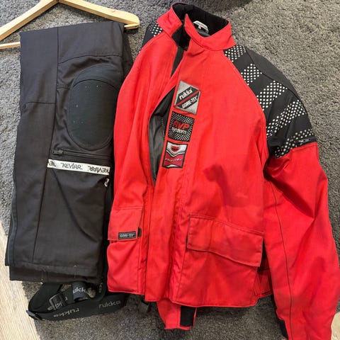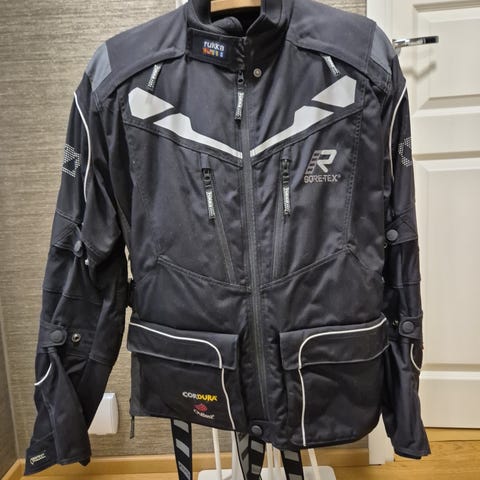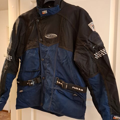 Hyvä rukan ajopuku uuden tieltä pois,kaikki muut suojat paikallaan paitsi takista puuttuu selkäsuoja,sisävuoret mukaan,housujen kokomerkintä 54 c2 normaali.Takin koko 54.Ehjä puku kaikin puolin.