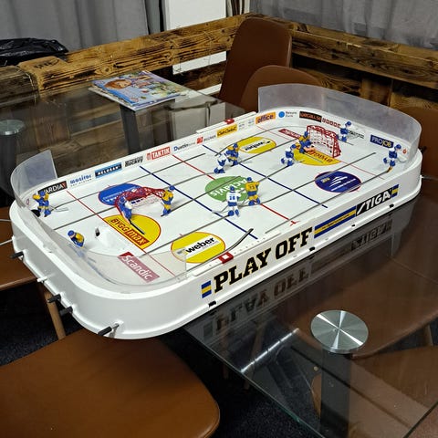 Pari vuotta hyllyllä pölyttynyt Stiga play off peli. Pieni kolhu tullut kenttään (ks. kuva) mutta ei haittaa ukkeleiden liikkeitä. Kaikki osat toimii ja mukana tulee kaksi kiekkoa ja muuta varaosa sälää.