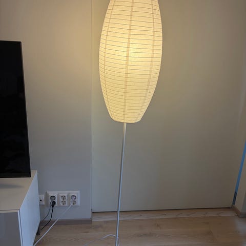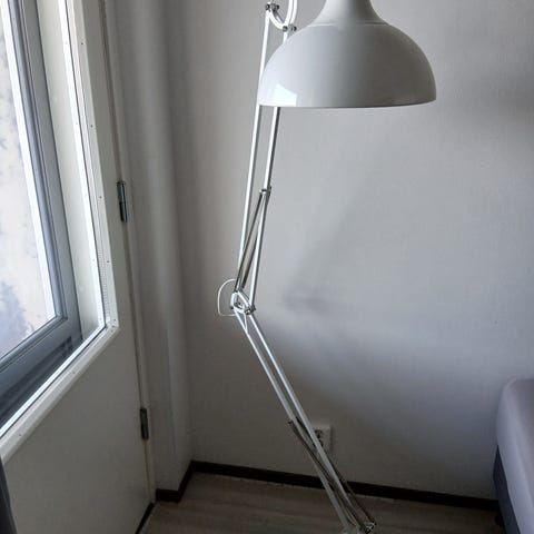 Harmaa jalkalamppu, korkeus 155cm, jalustan halkaisija 22cm.