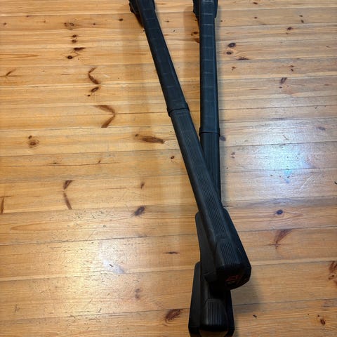 Mitsubishi kattokaiteisiin kiinnitettävät kattotelineet. Telineissä on alumiiniset poikkiputket ja mustat jalustat, joissa Mitsubishi-teksti. Putkien päät on suojattu muovipäillä. Telineet kiinnittyvät auton pitkittäisiin kattokaiteisiin ja niissä on lukittavat kiinnikkeet. Soveltuvat tavaran, kuten kattoboksin tai muiden kuljetustarvikkeiden, kuljettamiseen auton katolla. Pituus ja tarkemmat mitat näkyvät kuvissa mittanauhan kanssa. Taakka/suksitelineet integroituihin kiskoihin. Päivävuokra 10€ viikkovuokra 40€. Helpot asentaa ja lukita. Taakkatelineeseen helppo asentaa esimerkiksi suksiboxi.