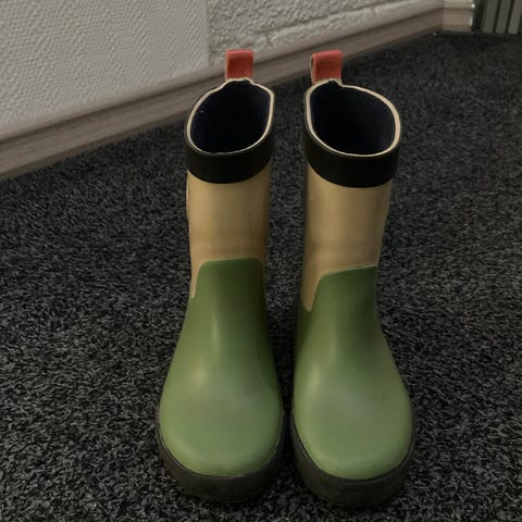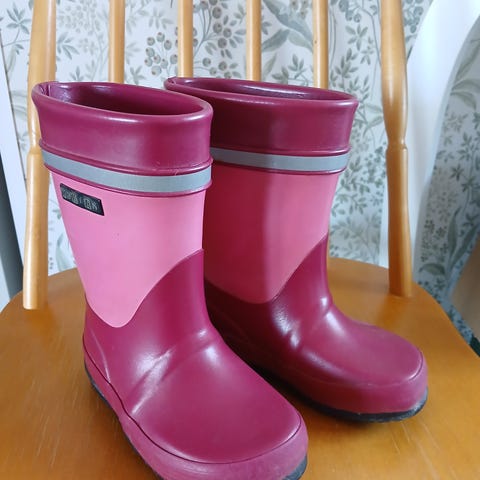 Yhdellä lapsella käytössä olleet kumisaappaat. Jonkun verran naarmuja pinnassa, mutta on ehjät.