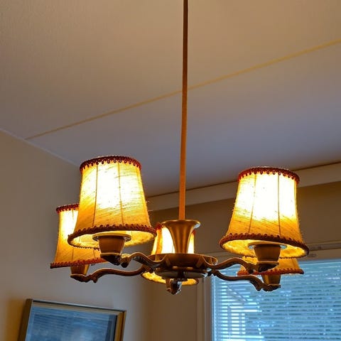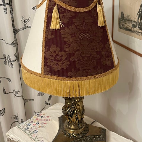 Messinkinen pöytävalaisin 1930-luvulta, isolla kauniilla varjostimella. Kokonaiskorkeus n 58 cm, varjostimen halkaisija n 35 cm.
