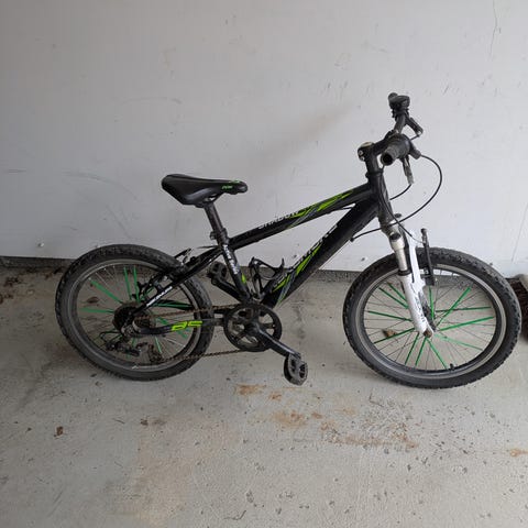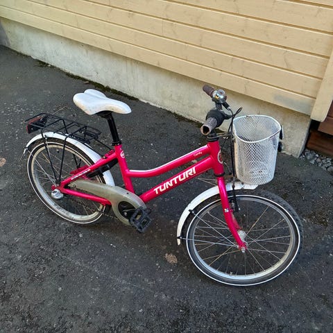 Lasten polkupyörä, jossa 20" renkaat. Runkomalli on matala, mikä helpottaa kyytiin nousemista. Pyörässä on sinivalkoinen runko, valkoinen satula ja kädensijat sekä takatavarateline. Etu- ja takapyörissä on heijastimet. Mukana on myös soittokello ja ketjusuoja. Soveltuu lapselle, jolle 20"-kokoinen pyörä on sopiva. Toiset renkaat mukaan. Toimii, vanha pyörä.