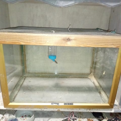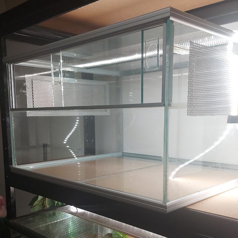 Kulmamallinen terraario, jossa puinen kansi.