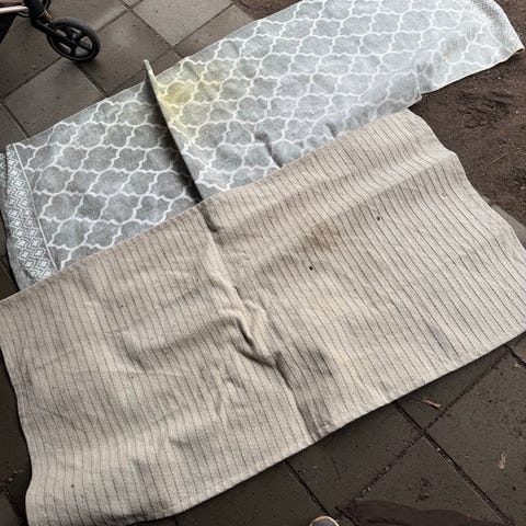 Kaksi suurta tyynyä, punainen ja musta. Ehkä vanhoja sohvatyynyjä.