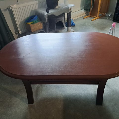 Myydään puukuvioinen sohvapöytä. Kuvissa näkyy viat eli naarmu ja reunan kolhut. Vain nouto!