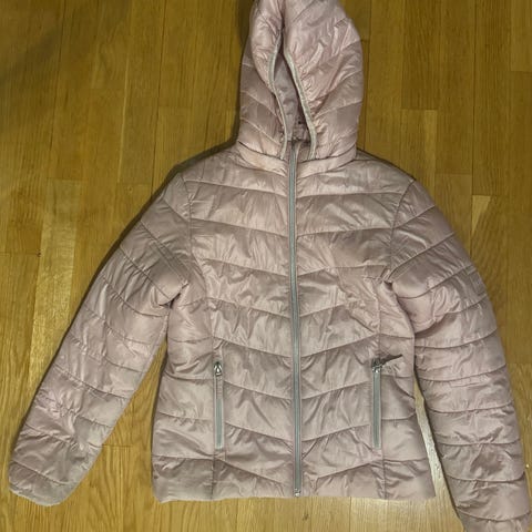 Ohut toppatakki, koko 146/152. Kaulus, irrotettava huppu, vetoketjutaskut. Kyynärpäiden kohdalla joitain käytön jälkiä (kuva).