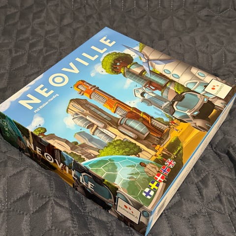 Blue Orange Neoville lautapeli. Kaupunkirakentelupeli, jossa pelaajat rakentavat ekologista futuristista kaupunkia laattojen ja rakennuspalikoiden avulla. Pelilaatikossa on pelilautaosat, rakennuslaatat, pystyyn asetettavat tornit sekä monikieliset ohjeet, mukana myös englanninkieliset säännöt. Peli on suunniteltu useammalle pelaajalle ja soveltuu perhe- ja harrastepelaamiseen.