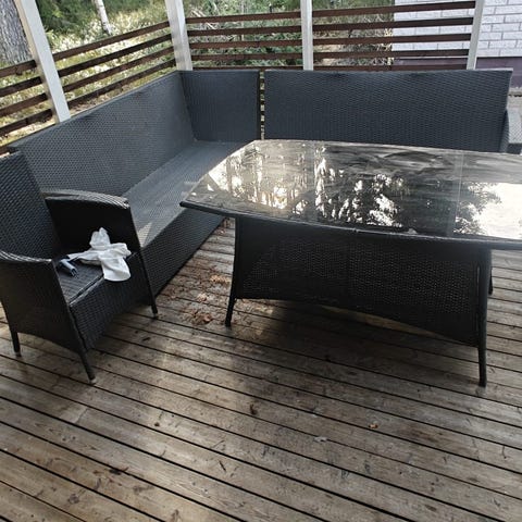 Myydään terassikalusteet. Polyrottinki mennyt hauraaksi, ja monesta kohtaa rikki. Itse rungot ehjät, samoin pehmusteet. Tästä kalusteet vaikka autotalliin?