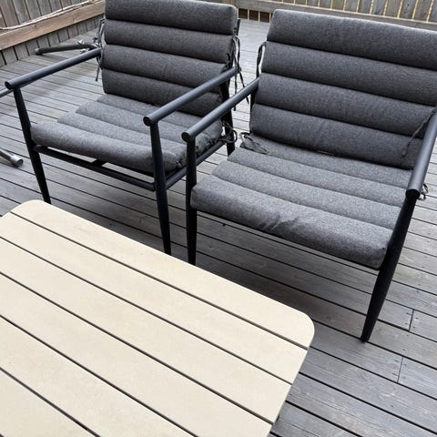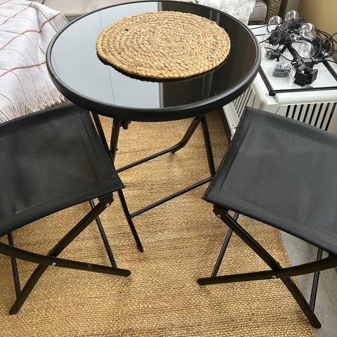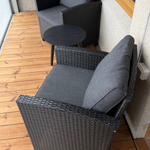 Parvekesohvaryhmä, johon kuuluu kaksi pyöreää nojatuolia ja pyöreä pöytä. Kalusteet ovat mustaa polyrottinkia, pöydässä on lasikansi. Nojatuoleissa on irrotettavat istuintyynyt. Sopii parvekkeelle tai terassille ulkokäyttöön.