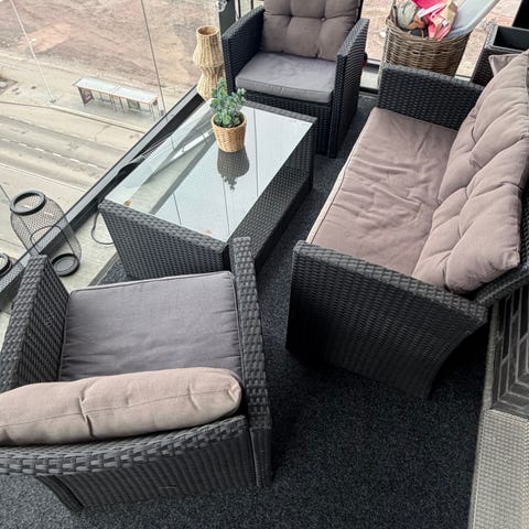 Parvekesohvaryhmä polyrottinki musta lasipöydällä