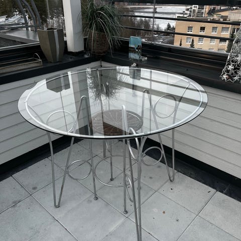 Puuterassipöytä ulkokäyttöön. Pöydän kansi on ruskeaksi käsiteltyä puuta, jossa on sälemäinen rakenne ja keskellä reikä mahdolliselle aurinkovarjolle. Sopii terassille tai parvekkeelle ruokailu- ja oleskelukäyttöön. Alumiini runko. Ollut pari kesää käytössä. Pituus 150 cm, Syvyys 90 cm ja korkeus 75 cm.