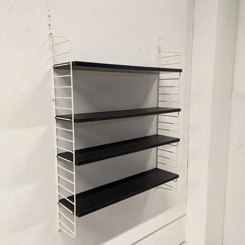 Kahden hylly tiikki String myytävänä. Kunto ikäänsä nähden hyvä. Päädyissä muutamia maalivikoja ja hyllyissä ajan tuomia jälkiä. Rakenteeltaan ehjä.