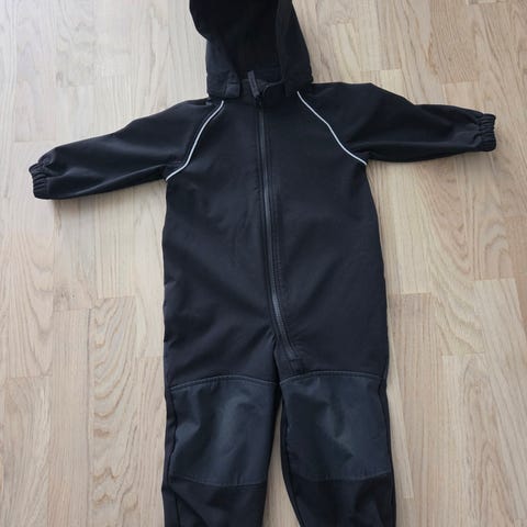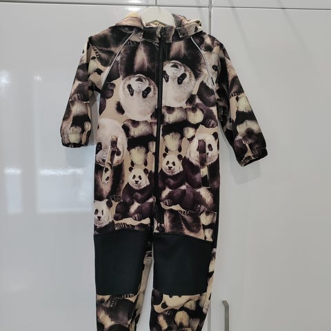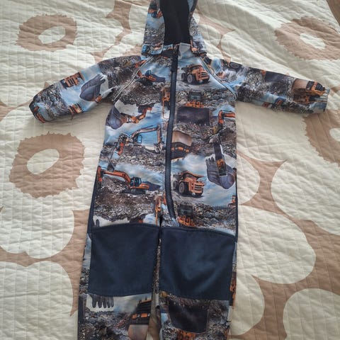 Name it lasten softshell-haalari, koko 86. Haalarissa on vaaleanpunainen sävy ja monivärinen hevoskuvioinen kangas. Vahvistetut polvi- ja takapuoliosat. Puvussa on pieni reikä joka näkyy kuvassa.