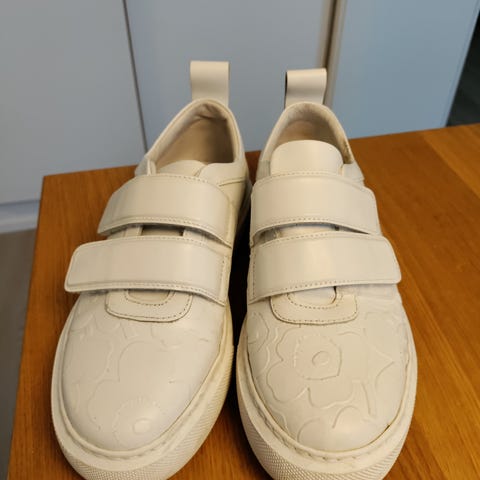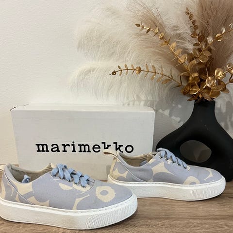 Myydään käytetyt Marimekon Niittyheinikossa-tennarit. Tennarit on valmistettu Kivet-kuosisesta valkaisemattomasta puuvillamarkiisista. Kengissä on 4 cm paksut kumipohjat.