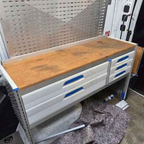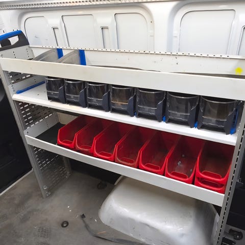 Pakettiauton hyllyjärjestelmä metallia. Hylly koostuu useasta vaakatasoisesta hyllylevystä ja rei’itetyistä päätylevyistä, jotka mahdollistavat työkalujen ja tarvikkeiden järjestämisen. Soveltuu asennettavaksi pakettiauton sivuseinälle työkalujen, varaosien ja muiden pientarvikkeiden säilytykseen. Materiaalina metalli, rakenne suunniteltu ajoneuvokäyttöön. Toiseen hyllyyn löytyy myös kolmas hyllytaso joka on irroittettu tilan tarvitsemiseksi.