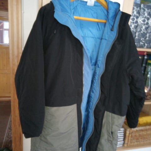 Hupussa irrotettava karvareunus ja vyötäröllä kiritysnyöri. Päällinen puuvillaa. Koko 52/L.