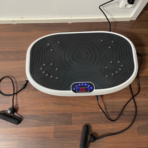 Värinälevy harjoitusalusta kotikuntoiluun. Laitteessa on harmaa, kuvioitu ja nystyröity seisonta-alusta sekä oranssi reunus. Yläosassa on ohjauspaneeli näytöillä ja painikkeilla, joilla voi säätää laitteen asetuksia. Mukana tulee virtajohto. Soveltuu tasapaino-, lihaskunto- ja aktivointiharjoituksiin seisten tai kevyiden liikkeiden kanssa.
