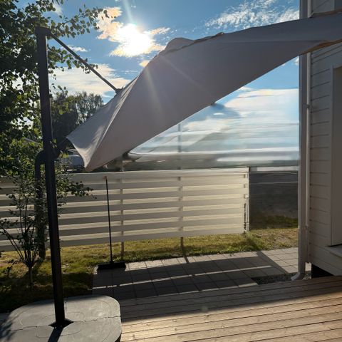 Hyväkuntoinen. Saa levitettyä isommaksi ja kuomua säädettyä ylös tai alas. Vettähylkivää kangasta.