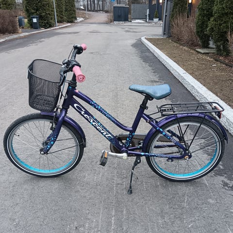 Crescent lasten 3-vaihteinen polkupyörä, jossa 20" renkaat. Pyörässä on matala runko helpottamaan kyytiin nousua, jalkatuki, käsijarru sekä jalkajarrut.