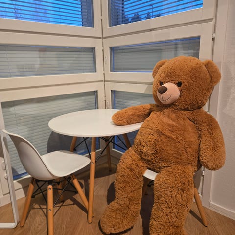 Lapsille sopiva pöytä ja 2 tuolia. Toinen tuoli tarvitsee hieman liimaa.