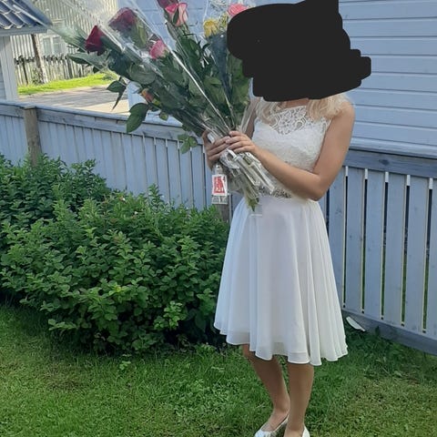 Kerran rippijuhlissa pidetty polvi mittainen juhlamekko. Takana vetoketju. Napakka kangas, ei veny ollenkaan.