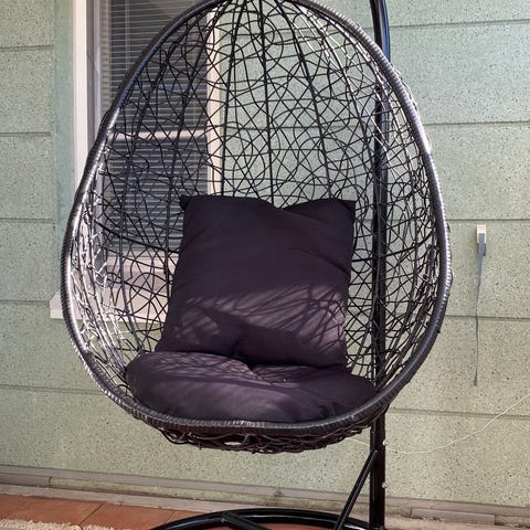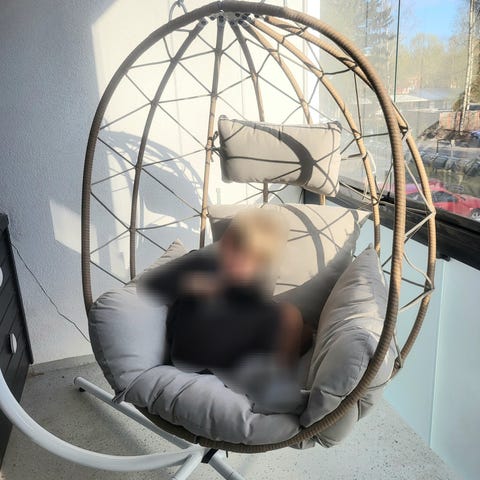 Kaksipaikkainen riipputuoli parvekkeelle tai terassille. Tuolissa on musta, punottu runko ja harmaat, paksut istuin- ja selkäpehmusteet sekä kaksi pientä tyynyä. Riipputuoli kiinnittyy ylhäältä ketjuilla. Sopii kahdelle istujalle ja tarjoaa istumapaikan rentoutumiseen ulkotilassa, kuten parvekkeella tai terassilla.