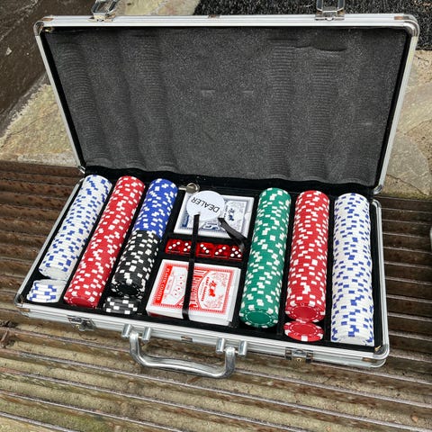Salkussa on useita eri värisiä pelimerkkejä, kaksi korttipakkaa sekä pelimerkkeihin liittyviä lisätarvikkeita. Salkku on kovakantinen ja metallinvärinen, ja se soveltuu pokerin ja muiden kasinopelien pelaamiseen kotona tai vapaa-ajan pelikäyttöön. Salkun ulkopuolella pieniä naarmuja kun yritin poistaa pinttynyttä likaa.
