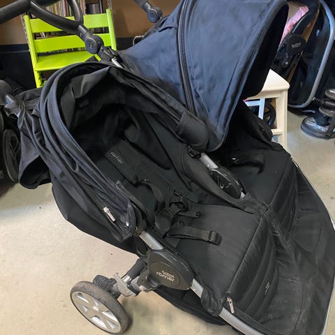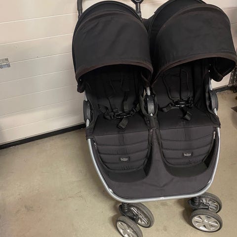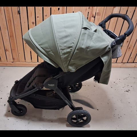 Ylimääräisenä käytetyt Britax lastenrattaat sinisellä kuomulla. Rattaissa on kolme pyörää, joista etupyörä on kääntyvä (saa myös lukittua).