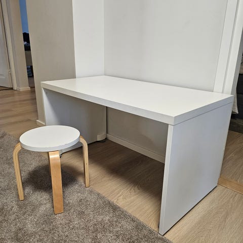 Lastensetti, johon kuuluu valkoinen lastenmukainen pöytä ja tuoli puujaloilla. Pöydän kansi on muotoiltu kaarevaksi ja tuolin selkänoja on eläinhahmon muotoinen. Pöytä ja tuoli soveltuvat lapsen piirtämis-, leikki- ja askartelupaikaksi. Väri on pääosin valkoinen, jaloissa luonnonpuun sävy ja valkoiset jalkojen päät. Materiaalina yhdistelmä puuta ja puupohjaista levyä. Setti on mitoitettu pienille lapsille sisäkäyttöön. Pieni kauneusvirhe kannessa. Tuoli kestää n 90kg painoa.