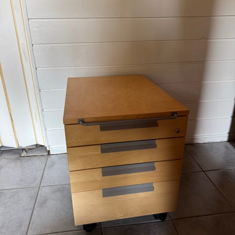 Jyskin (?) pieni laatikosto/lipasto, muuten hyväkuntoinen mutta päällä kulumaa, maali kulunut ja tahraa. Laatikot toimii. Säilytetty hanskoja, pipoja yms.