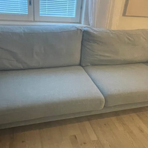 Muuten hyvässä kunnossa, mutta pieni sävyero divaaniosan ja muun sohvan välillä.