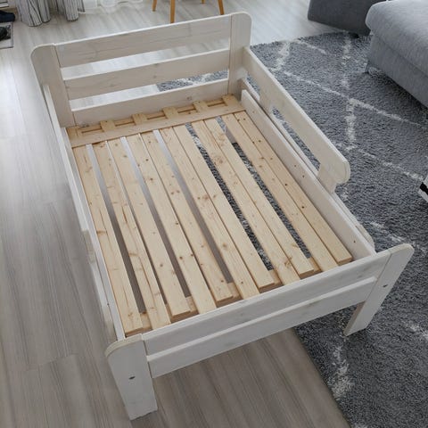 Lasten jatkettava sänky. Leveys 80cm. pituus 100 - 189 cm Sängyssä on laidat molemmilla sivuilla ja pyörillä liikkuva säilytyslaatikko sängyn alla. Pituutta voi säätää lapsen kasvaessa.