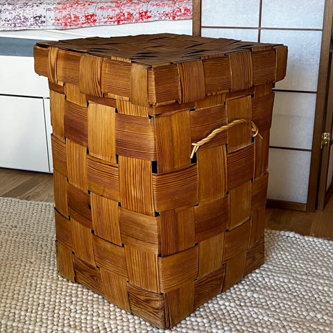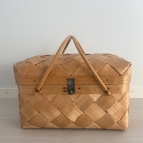 Pärekori, jossa vaneripohja. Kahva ja koristereuna rottinkia. Korin korkeus 24 cm. Pohjan leveys 26 cm. Joissakin päreissä kulumaa. Nouto käteismaksulla.