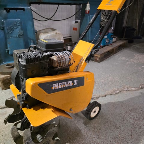 Jokusen vuoden käyttämättömänä maannut jyrsin, moottori ainakin pyörii. Vanhaa bensaa tankissa, en kokeillut käyntiin.