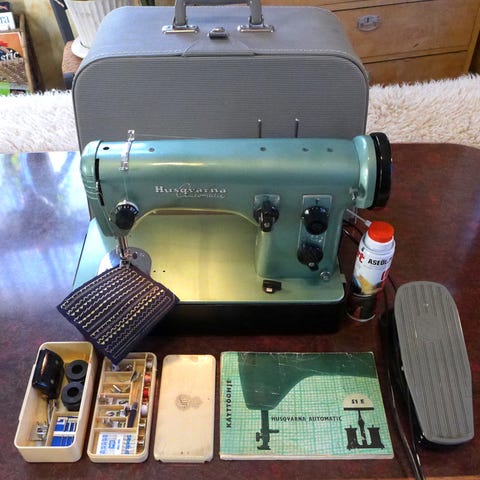 Poljettava Husqvarnan ompelukone. Toimivuudesta ei tietoa.