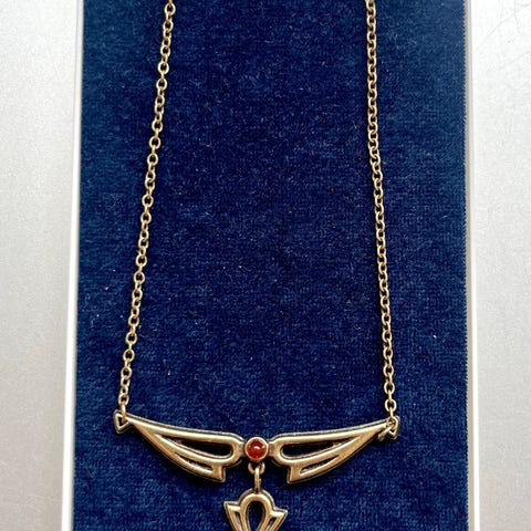 Tony Granholmin suunnittelema Kalevala Illusioni-setti. Pronssi ja kivinä karneoli. Kaulakorun ketjussa säätömahdollisuus.