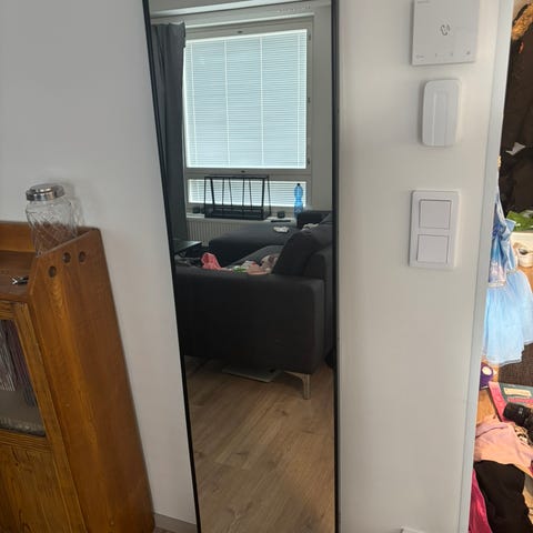IKEA Enudden -sarjan suorakulmainen metallikehyksinen peili. Kehys on valkoinen ja kapea, sopii esimerkiksi eteiseen, makuuhuoneeseen tai kylpyhuoneeseen seinälle ripustettavaksi. Peili on yksinkertaisen mallinen ja helppo yhdistää erilaiseen sisustukseen.