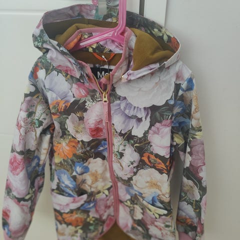 Molon kukkakuosinen takki, kunto hyvä mutta edessä hieman tahraa harmaalla pohjalla.