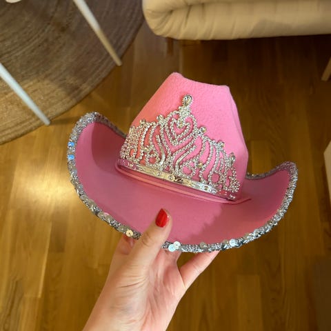 Naisten cowboy-tyylinen hattu. Hattu on vaaleanpunainen ja siinä on reunassa strassikoristeinen nauha sekä edessä strasseilla tehty kruunukuvio. Sisäpuolella on nauha, jolla hattua voi säätää ja kiinnittää paremmin päähän. Sopii esimerkiksi pukeutumisasuksi tai teemajuhliin. S kokoa.
