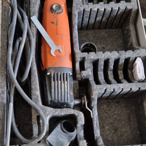 Fein monitoimityökalu sähkökäyttöisenä runsailla varusteilla. Terän vaihto tapahtuu pikalukituksella, ei tarvitse ruuvailla. Mukana useita erilaisia teriä ja -laikkoja, osa käyttämättömiä, kolmionmuotoiset hiomapohjat, sekä muita lisävarusteita kuten esim. pölynpoistoon imurille tarvittavat osat. Alkuperäinen muovilaukku, jossa on lokerot koneelle ja terille. Konetta käytetty vain harrastuskäytössä, eli oman vanhan talon remontissa, melko vähäisellä käytöllä ollut, ikä on noin 15 vuotta. Hyväkuntoinen laatukone.