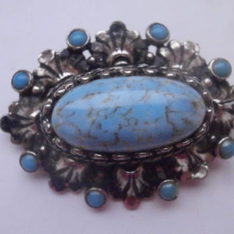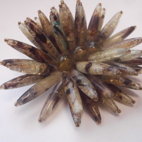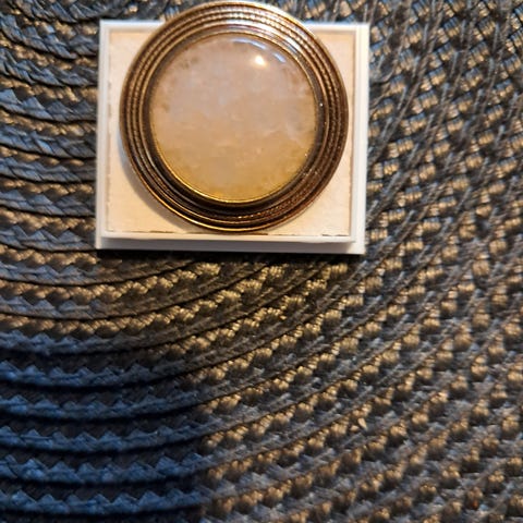 Kaunis rintakoru ruskeaa muovia ja kullanväristä korumetallia. Halkaisija 3,8 cm. Neulakiinnitys, lukko. Ehjä ja siisti. Postitus tai nouto.