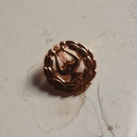 Kultainen 14k 585 ylioppilas/äidin lyyra. Pieni neulakiinnitys takana. Halkaisija 16mm. Paino 0.76g!